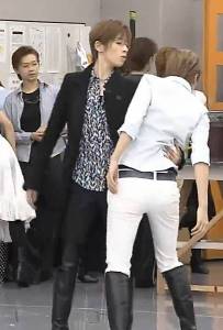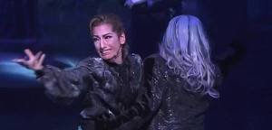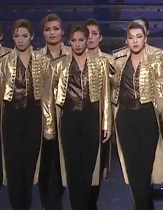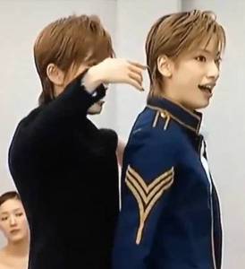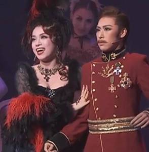 2016年Rei在MEMY男役大階段是以賈姬的女役妝配上燕尾服,這次的男役大階段,馬蹄以美人魚眼妝配上金色燕尾服;太有趣了!這對95雙子都有著女役妝跳大階段的經歷!有種混搭的效果,大階段時男役魅力不減!(下圖第二位)