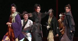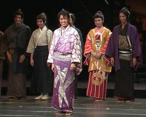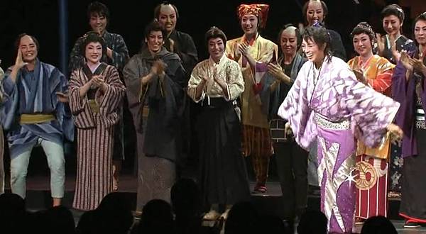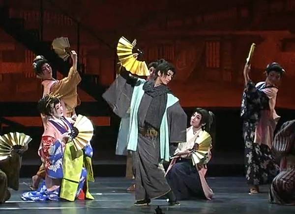 劇後秀非常的美式,不要懷疑,穿著和服跳著日舞,但很美式,可能舞台後那金屬樓梯讓我想到百老匯的舞台,這部劇名後面有「OH!Edo Night Show」指的應該是這秀,小劇場也有劇後秀呢!劇後秀一開場就是Rei帶領的群舞,每個轉身好有力、拿著扇子跳舞也能乾淨俐落!江戶時代的造型,也能夠跳帥氣的舞、當帥氣型男,不禁為他喝采!
