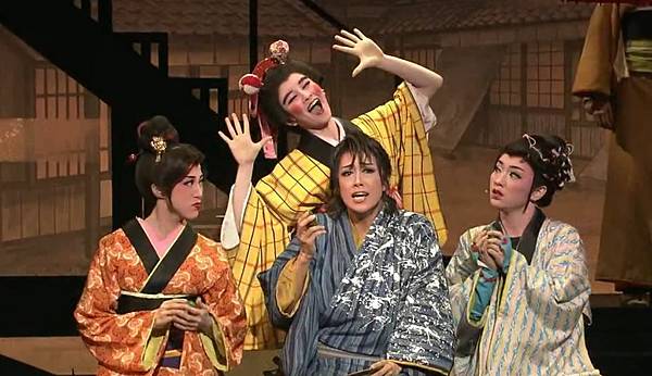 這是2015年蜜醬到花組特出主演的小劇場,在開場群舞,聽說櫻咲彩花在這劇表現搶眼,光是從這個群舞就能感覺的到櫻咲彩花特別動感有元氣(左方水藍色長褲的娘役),Rei的舞蹈也很動感!Rei演的是反派,神情嚴肅。