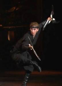 在花組有趣的短劇中,身體協調性極好的Rei扮演很笨拙的忍者,想要單腳站卻重心不穩搖搖晃晃。但是Rei的忍者扮相十分好看。