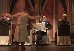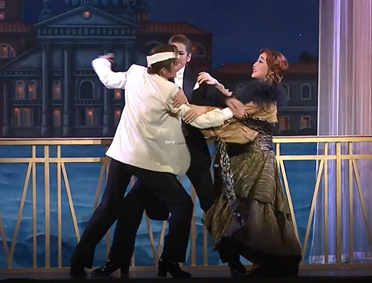 神父證婚—帆純急著請航琉Corelli找神父證婚,這裡幽默得表現出歐洲人辦事效率的平常心。航琉Corelli一口答應、一鼓作氣,感覺下一秒就要請出神父了!卻是呼喚下一位侍者出來,侍者出來後再帥氣的呼喚接力,一位接著一位,帆純Beddini越來越急,最後神父才現身了。這裡每位侍者的帥氣姿勢、音調都不同,很有喜感!!最後帆純終於與神父相遇,千呼萬喚始出來的神父卻是冒牌的!配樂還是歌劇 塞維利亞理髮師Il barbiere di Siviglia 的曲子,充滿了義式風格,太有趣了!很喜歡這一段!!這幾位小男役很亮眼!