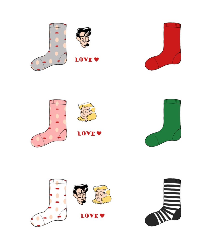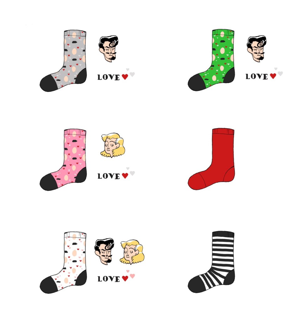 睡衣裝的襪子也是別出心裁、以不同色搭配的,襪子的花色有Dale圖案的也有Beddini的,還有雙人圖案的。