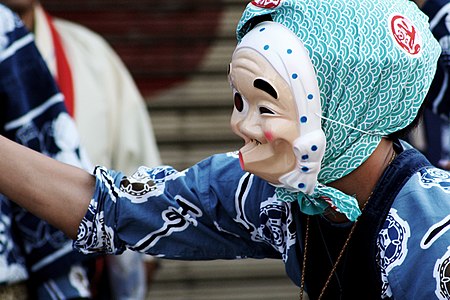 中間一段舞蹈是一對帶著面具的男役與娘役,男的叫做ひょっとこ(火男),女的是阿多福(お多福),滑稽形象的中年男子、女人,常常出現在傳統祭典中。