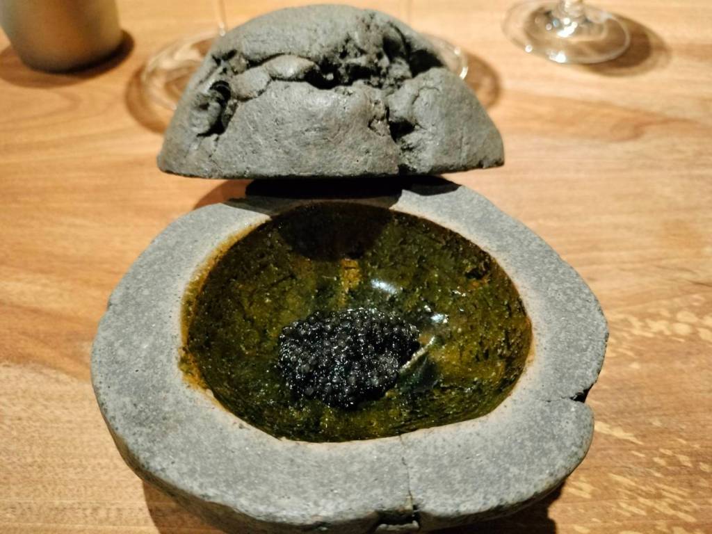 盛菜的容器,是實用也是美觀!質樸東方的美感。打開蓋子,好像是裡面有什麼玄機,一看便覺得是稀奇的食材,魚子醬是溫的,石碗很盡責的保留了烤過的溫度。
