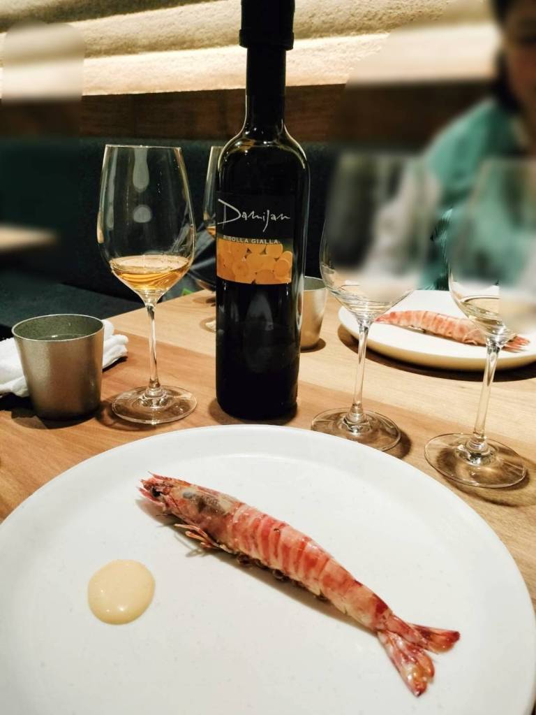 搭配的是法國的酒,一般白酒的製作會先把葡萄去皮,這裡搭配的酒是整顆一起處理一下下,再去皮,因為皮留在葡萄處理的時候只有一下下,所以酒的顏色是偏橙色。