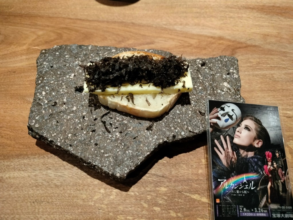 澳洲的松露,烤的酥酥脆脆的,平鋪於奶油之上,再由吐司支撐著,成了夾心的設計,置放在一塊平的石頭上。