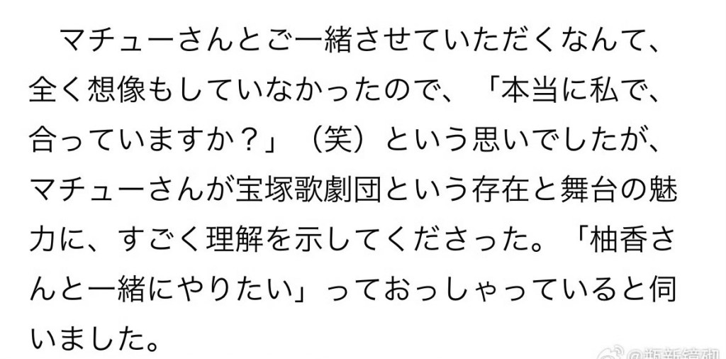 巴黎芭蕾舞蹈團首席馬修,詢問東京舞蹈團首席八菜小姐關於寶塚的形式,八菜小姐除了介紹寶塚,還說:我有個朋友就在寶塚歌劇團。後來他們倆人才知道,八菜小姐說的那個朋友正是柚香光啊!無巧不成書。