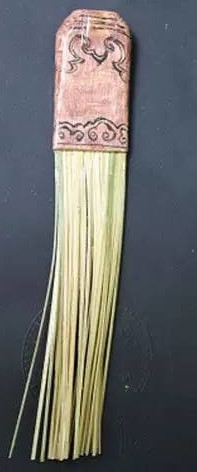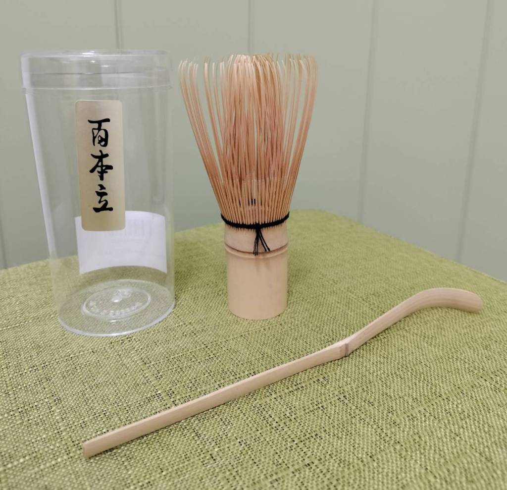 用細竹做的茶匙舀取茶粉末,放入碗中 (如同下圖的下方細細長條枝狀用具)