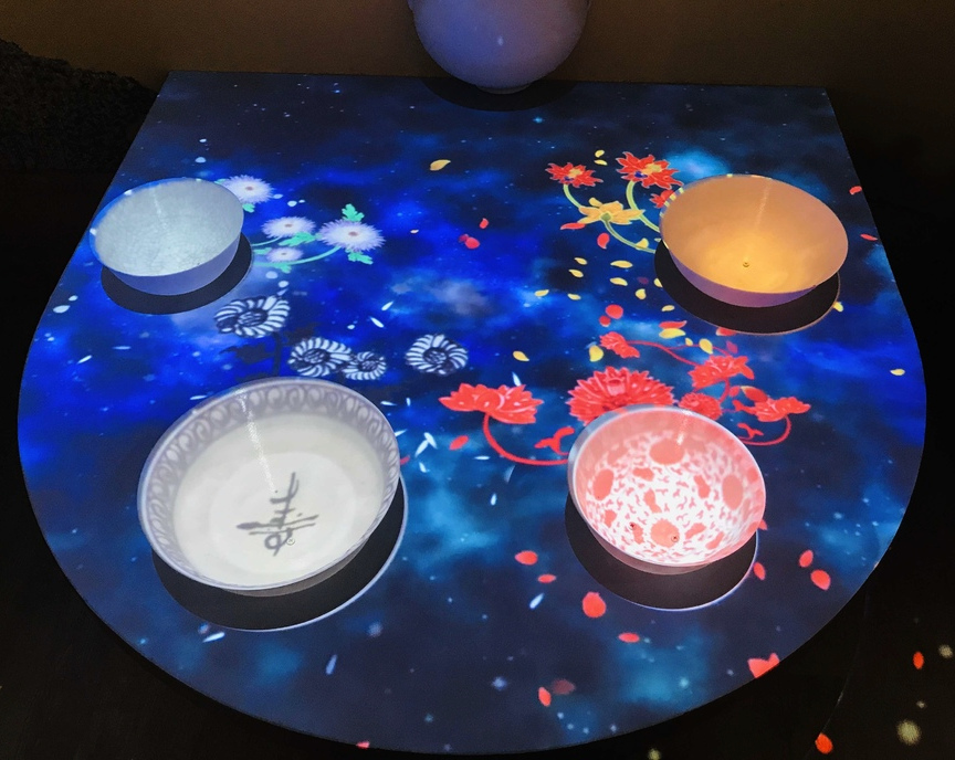 當時第一個茶碗,就是圖中左上的那個,我沒有很注意螢幕上顯示的資訊,旁邊的導覽員淺淺的說了一句:「這茶碗像是龜裂的紋路很厲害喔」,我還沒反應過來,孩子已經操作到第二個茶碗了。