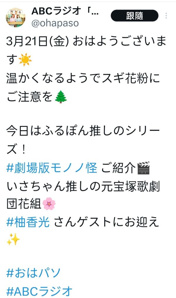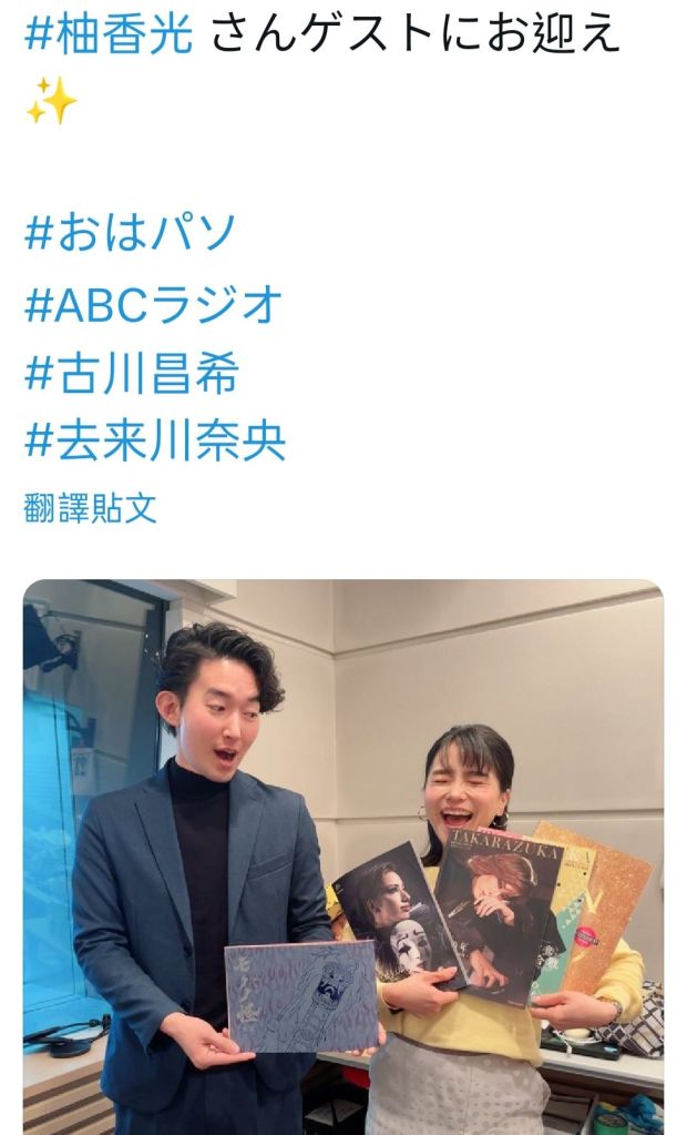 2025/3/21 8:10 AM ABC radio電台的訪談,一開始柚香光學著主持人的語調說著電臺節目的名稱與大家打招呼,大家都笑了,氣氛很輕鬆。