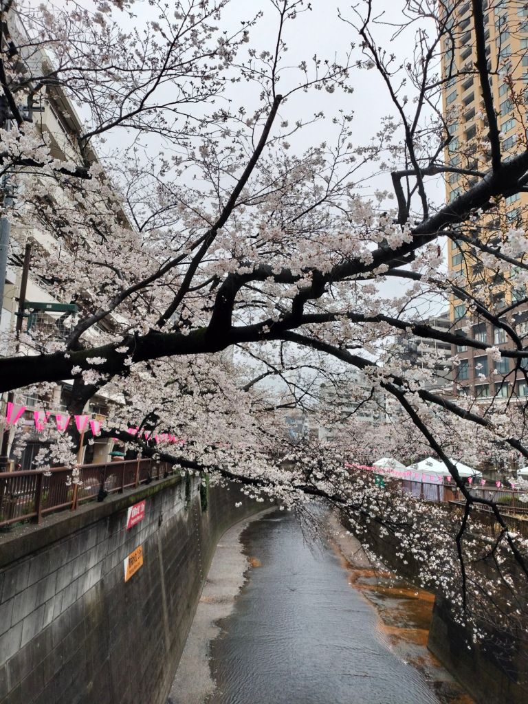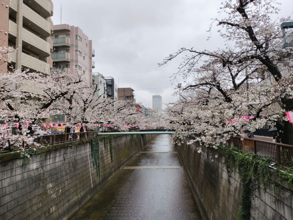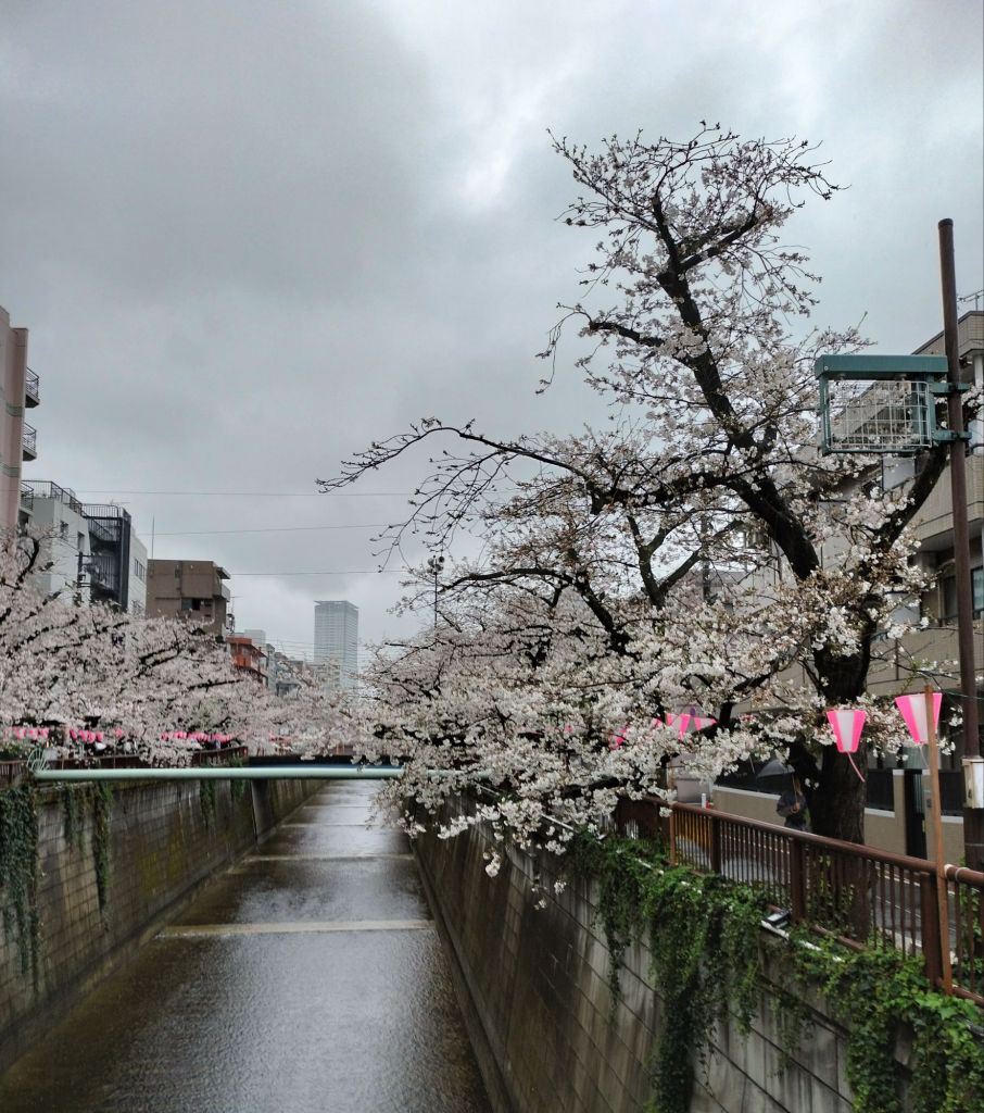 根據氣象報告,3月29日是櫻花盛開最旺的一天。但是今天的氣候明顯降低寒冷,且下雨了,與昨天截然不同的天氣。一大早來到中目黑,賞櫻的人比較少。