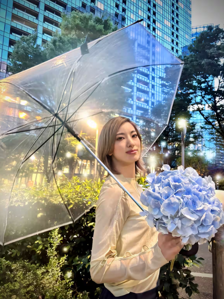 她手上捧著繡球花,讓我穿越到「Grand Mirage」,一直記得,秀一開始,舞台上的屏幕一層層往上升起,只到剩下最後一層是黑色紗網,隱約看到一身柔和藍紫花瓣白底燕尾服男役身影,就是柚香光,最後紗網也升起了!主題曲獨唱開始,柳暗花明、藍紫白協調出浪漫深情的翩翩君子。