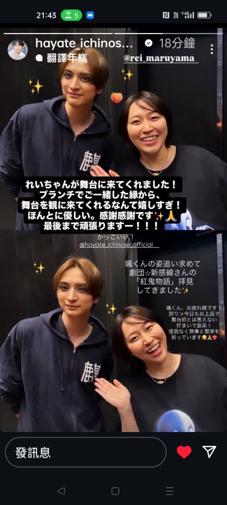 A:「大家都很棒,這是我第一次登台,所以我希望抱著從零開始學習的心態投入其中。大家的個性都很棒。一開始,柚香給我的印象是漂亮又堅強,但真正和她交流之後,我發現她其實很活潑,而且很關心我。作為劇團的座長,她非常重視溝通。」