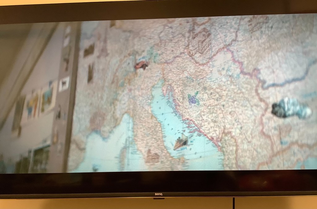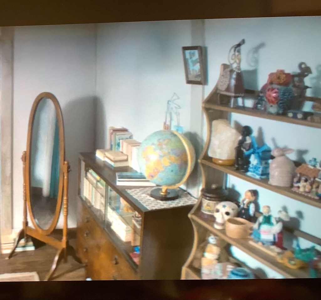 藍色元素在不同的場景有個別的象徵,也英臥房牆上的世界地圖是粉藍色底的,最核心的象徵是也英的希望、想要探索世界的志向,是自由飛翔。