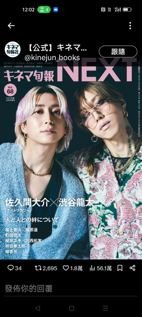 2025-11-222025-11-22 Lilian 20251122 キネマ旬NEXT 雜誌 キネマ旬NEXT Vol.68 有柚香光的報導,於2025/11/28發行, 博客來可以預訂,我已經預購了😃 【表紙解禁】11月28日発売『キネマ旬報NEXT Vol.68』表紙: #佐久間大介(#SnowMan) × #渋谷龍太(#SUPERBEAVER)(映画「#ナイトフラワー」)ほか:#福士蒼汰×#福原遥 #町田啓太 #桜井ユキ×#川西拓実(#JO1)#前田拳太郎 #柚香光予約▶https://t.co/aM1KAl03rH公式▶https://t.co/OnkCdqyo3d pic.twitter.com/yqfRkDWDqm— 【公式】キネマ旬報社 (@kinejun_books) November 18, 2025 The End 分享此文: 分享到 X(在新視窗中開啟) X 分享到 Facebook(在新視窗中開啟) Facebook 喜歡 正在載入... 相關