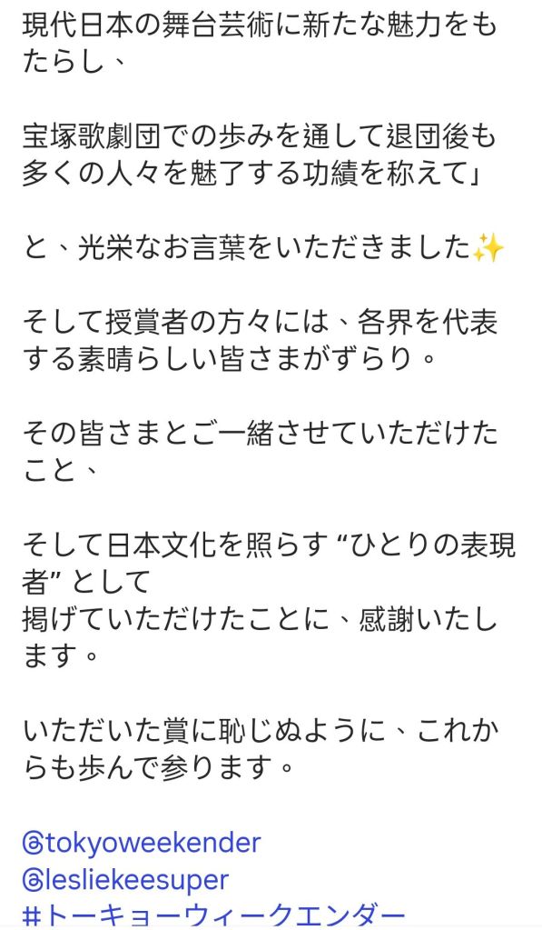 為紀念《東京週末》(Tokyo Weekender)雜誌創刊55週年,柚香榮獲「2025年TW Icon Awards」獎項,並出席了頒獎典禮!