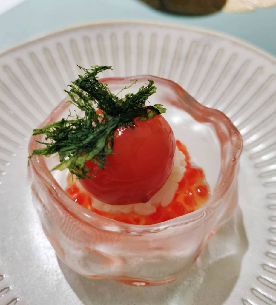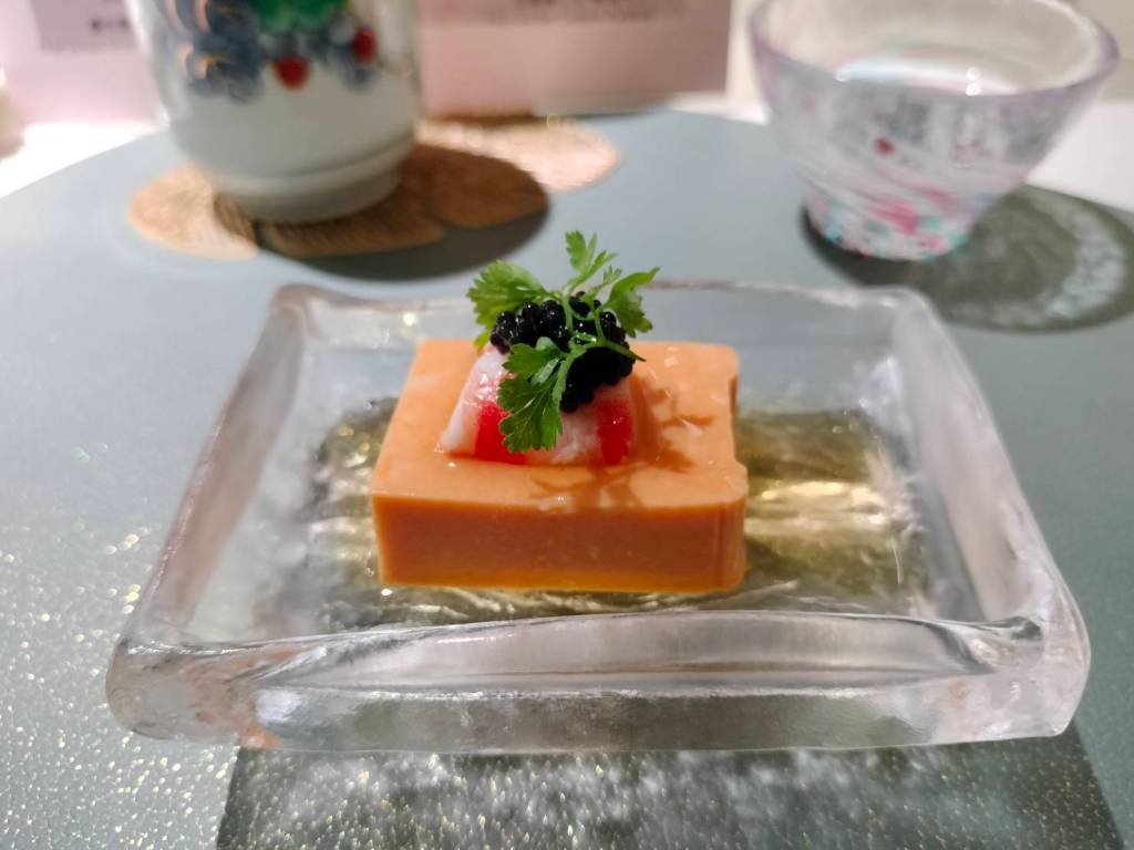 1 . 鮟鱇魚肝豆腐、日本車海老、魚子醬、山蘿蔔葉
