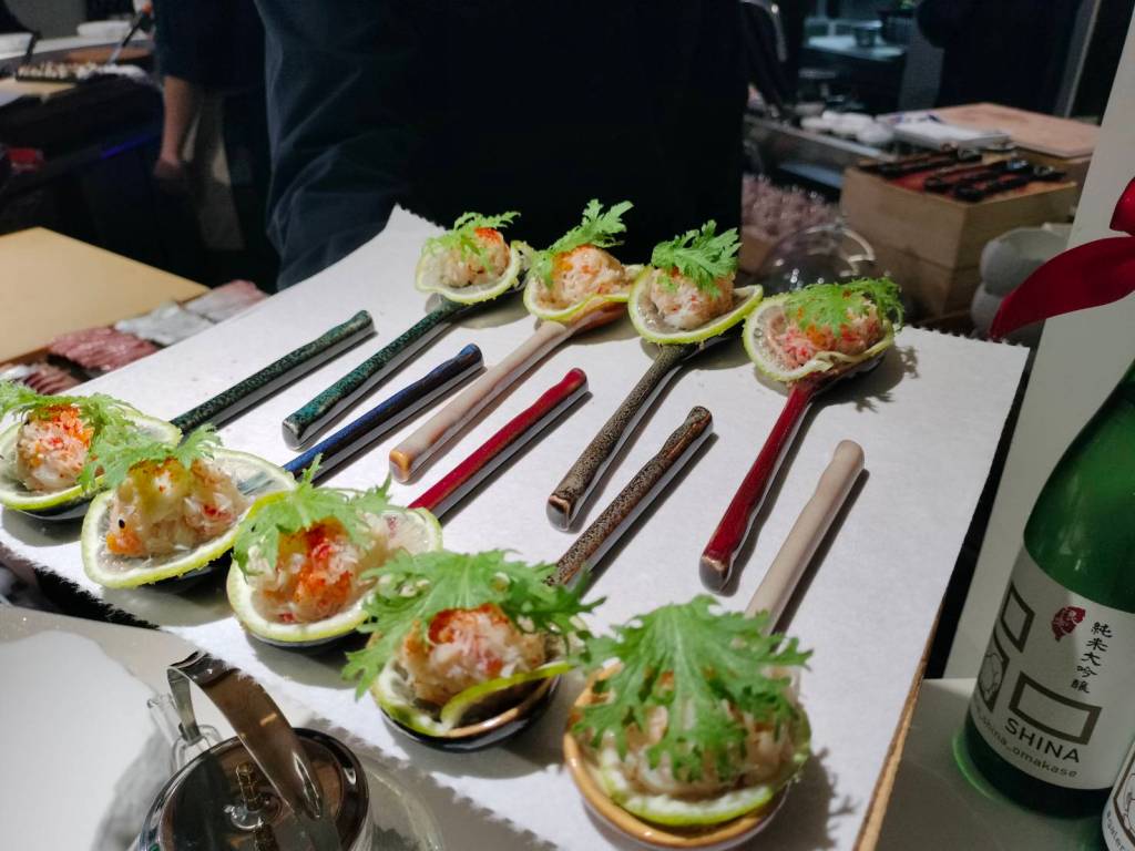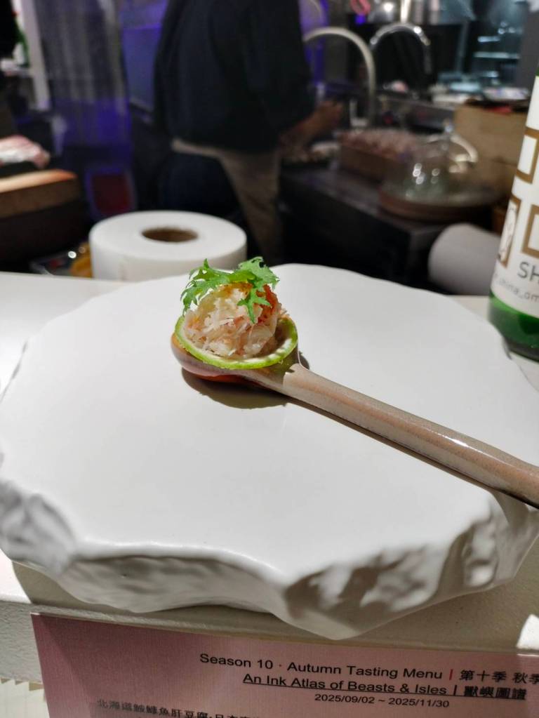 柔滑的白子與帶有柚子清香與溫潤辣味的寒作里形成鮮明對比,展現入秋特有的濃厚風味。