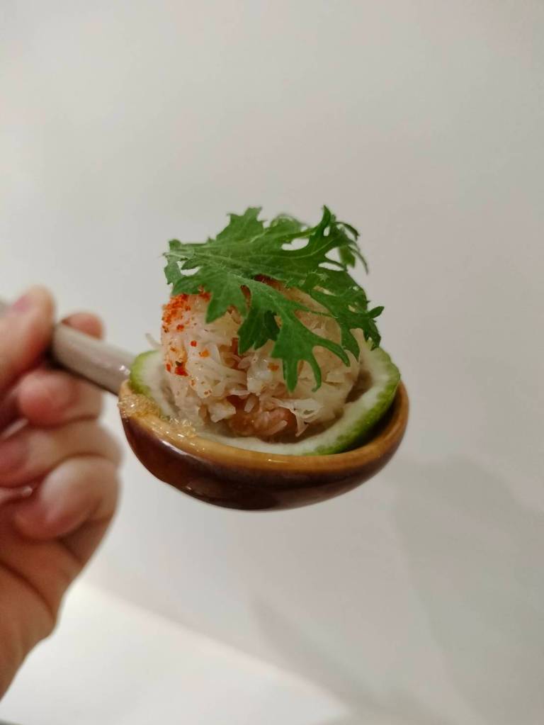 最底下是檸檬配上些微砂糖中和酸味,中間蟹肉伴隨著柑橘果乾,最上面綠色葉子是山葵葉,非常美的設計,這適合一口吃下去,一口氣品嘗不同層次的綜合味覺,如果一層一層分開吃不易感受到這道菜的厲害。