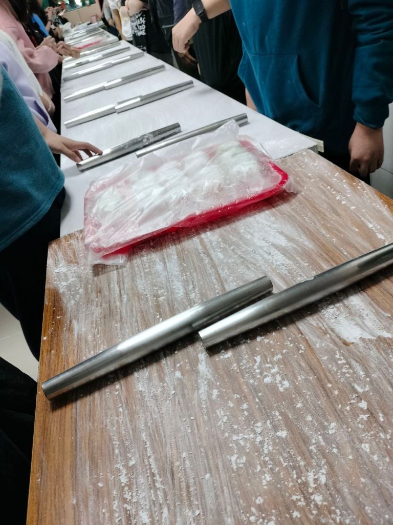 洗完蔥之後,剛剛作的蔥油餅已經煎好了。用之前領的號碼牌辨認自己作的蔥油餅,現煎的真好吃。