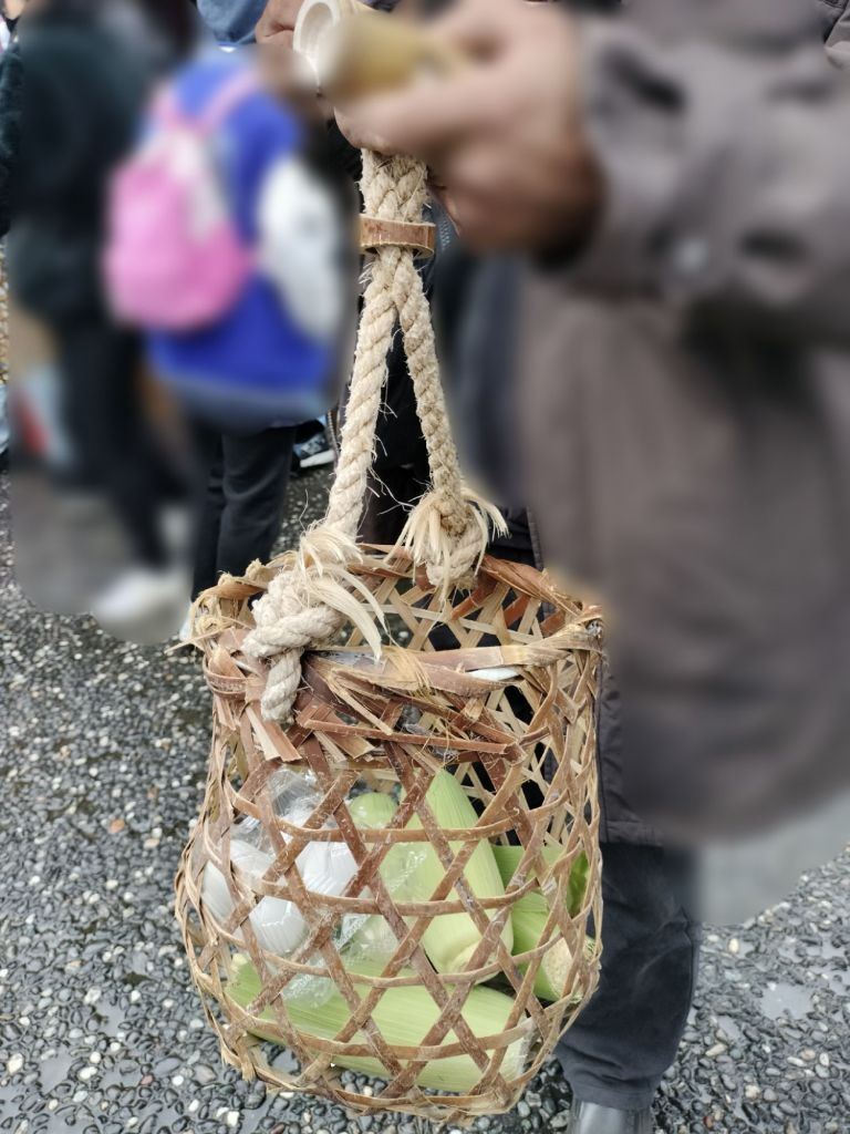 每人發了一顆蛋、玉米筍、玉米,還有竹簍,把食材放入竹簍,在放入地熱池裡煮熟。