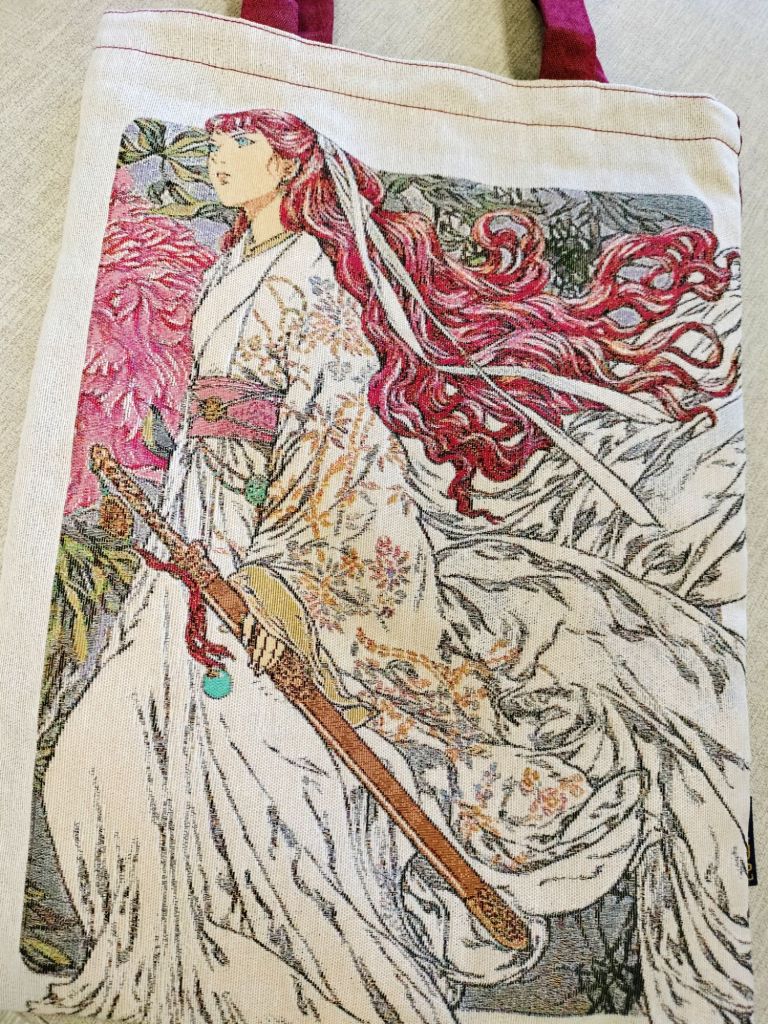 景王陽子手提袋是陽子穿著永遠之庭的服裝側站著,拿著掛有碧雙珠的水禹刀,這兩樣是身為慶國主君才能擁有的兩樣寶物。