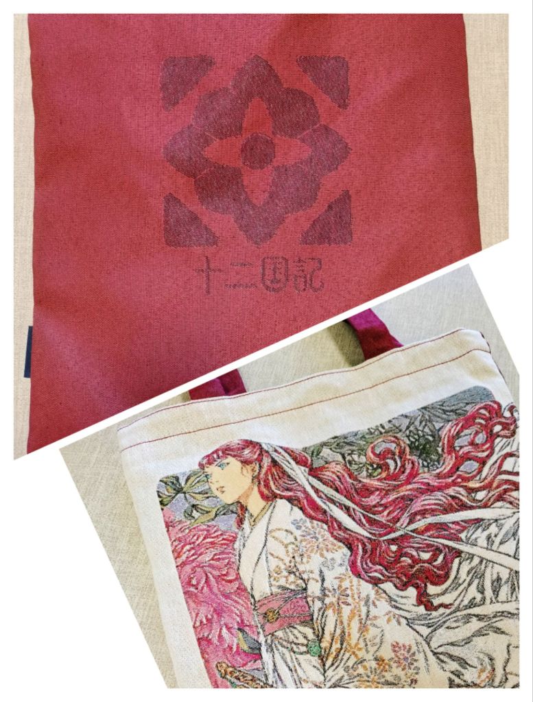 圖案是近似針織、刺繡的,視覺上有著層次感,不是扁扁的平面,是製作設計都很用心的手提袋。日本動漫小說之所以讓人們著迷的原因之一:上下游產業都很用心投入,更加質感化,具紀念性、耐用口碑好,功不可沒啊!