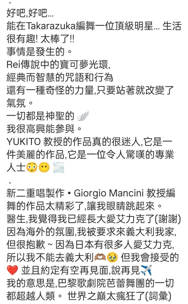 2026-01-072026-01-11 Lilian 20260106 芭蕾公演同仁的發文 2025年新年,在大阪的古典芭蕾公演的共演人員Alexander當時有些與共演同仁們,包括柚香光的合照,很珍貴的合照!! View this post on Instagram The End 以下是機翻中文 正確精準度不高,僅參考 分享此文: 分享到 X(在新視窗中開啟) X 分享到 Facebook(在新視窗中開啟) Facebook 喜歡 正在載入... 相關