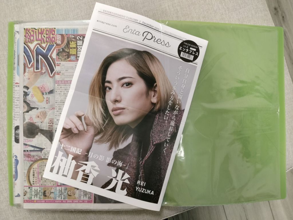 重壓了一夜,再把刊物放入大型資料夾,與有報導柚香光的報紙一起收藏。