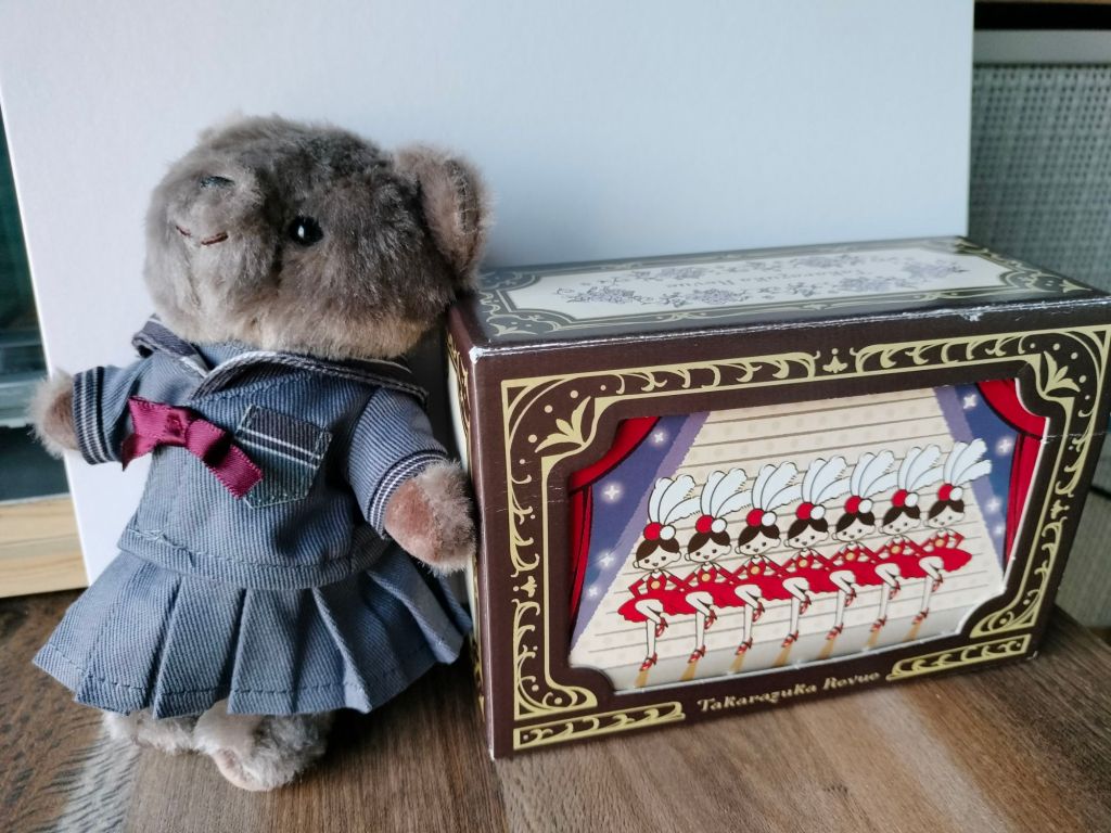 之前去寶塚大劇場買了伴手禮,圖案是寶塚歌劇團的象徵:大階段與line dance,盒子尺寸正好可以存放小熊的衣服。