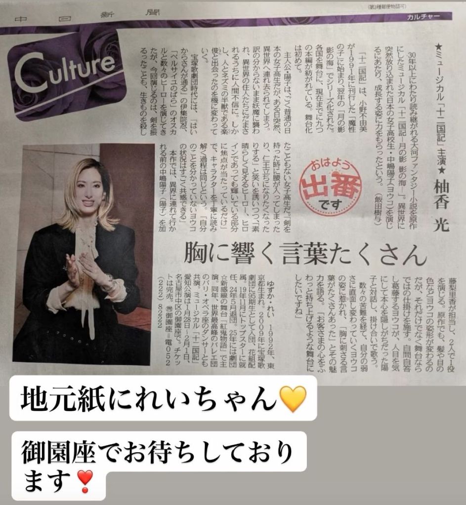 2026-01-222026-01-24 Lilian 20260125 名古屋公演排練結束 明天1/25 就是穿戲服的稽古了 今日も稽古に。少し遅めの稽古なのでマッサージ行けた💆ミュージカル最後の事件稽古もみんなとできるのは明日まで…ひぃ、、私は明日衣装付き通しをやってひとまずお終い。ここまで稽古時間足りないの不安だらけですが、、とはいえ、、失敗を恐れず!周りにサポートして頂きながら、、…— 太田基裕 motohiro ota (@motohiro0119) January 24, 2026 十二國記公演新聞上了名古屋地方的報紙 1/22 景麒 相葉裕樹說歌唱排練已結束 延麒去吃了名古屋的麻辣鍋 The End 分享此文: 分享到 X(在新視窗中開啟) X 分享到 Facebook(在新視窗中開啟) Facebook 喜歡 正在載入... 相關