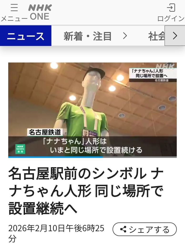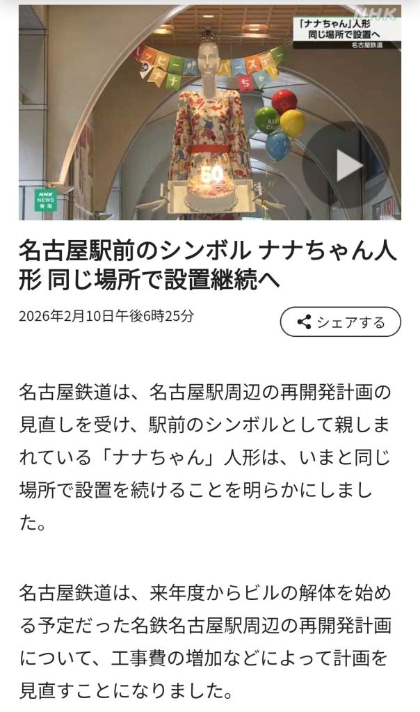 20260210 NHK新聞報導,2026年三月開始,名鐵百貨將拆除改建,位在名鐵百貨騎樓的Nana將保留在原位。