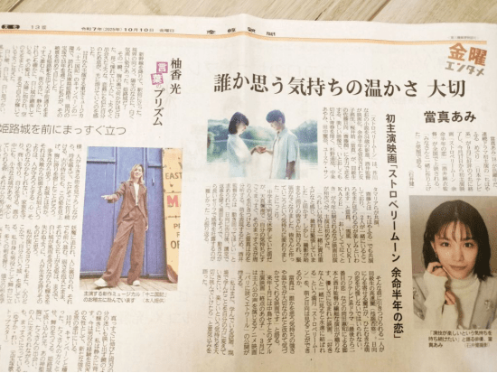 2025年10月10日這天的產經新聞,不僅刊登了柚香光的專欄,同一版面,也有當真あみ–哈姆雷特的奧菲莉亞演出者。