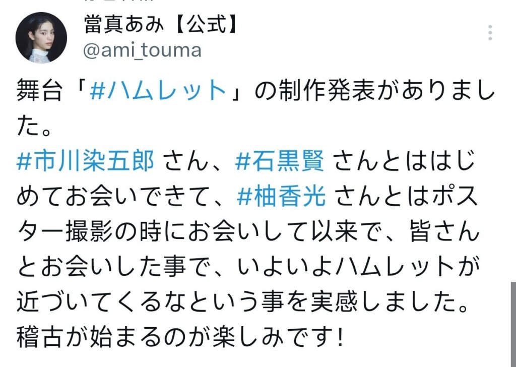 2026-02-262026-03-07 Lilian 202602 柚香光與當真同時上報 2026/2/24 哈姆雷特舞台劇發表會之後 大家紛紛注意演出陣容 我這時才發現 2025年10月10日這天的產經新聞,不僅刊登了柚香光的專欄,同一版面,也有當真あみ–哈姆雷特的奧菲莉亞Opheliaオフィーリア演出者。 真是太巧了!😃 當真說一年前就已經知道要演出哈姆雷特了。 上報的這一天,她們應該都已經知道這個演出消息了。 The End 分享此文: 分享到 X(在新視窗中開啟) X 分享到 Facebook(在新視窗中開啟) Facebook 喜歡 正在載入... 相關