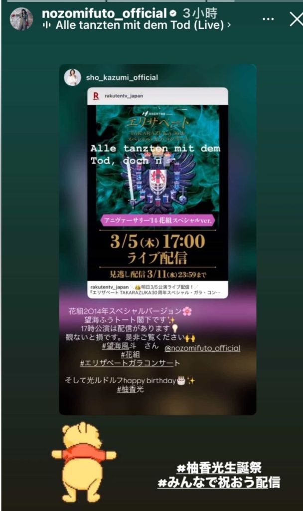 今天光的生日有伊莉莎白的公演,元花組OG和海與元雪組首席望海風斗都有發限動祝賀。