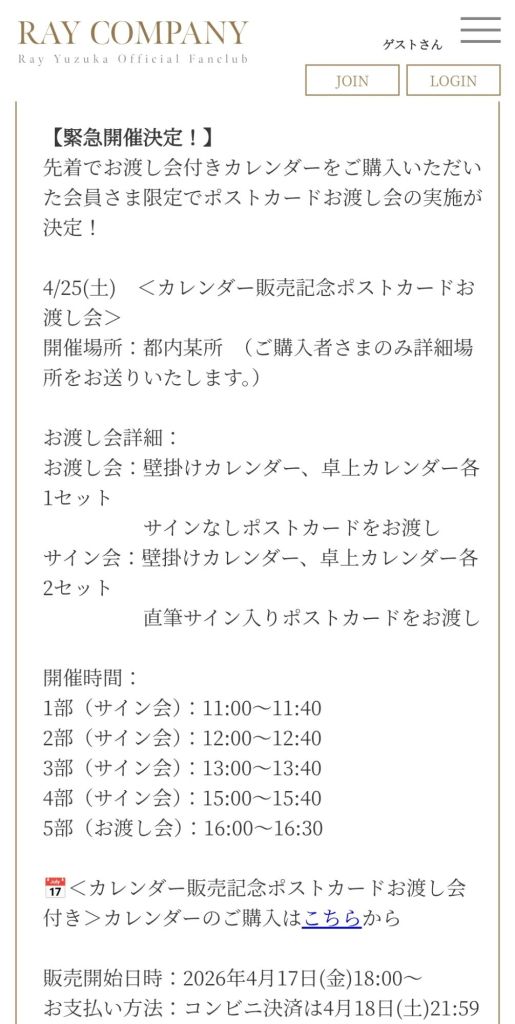 2026-04-17 Lilian 20260416 柚香光月曆販售見面會 2026年4月~2027年3月 有月曆也有桌曆兩款 好時尚,根本是名模😍 4月25日有舉辦販售活動 現場購買,柚香光會親自將桌曆交給購買者。 這是第一次舉辦見面會的活動啊! ついに!😆しかもお渡し会とな!?しかし既に予定がある日だった🥲お見送りでも溶けてしまうので逆に良かったかもしれない😂RAY COMPANY|「RAY YUZUKA OFFICIAL CALENDAR 2026.4-2027.3」発売が決定しました! https://t.co/fYOsrDxZM2— レビト (@goisyoumetu) April 16, 2026 The End 分享此文: 分享到 X(在新視窗中開啟) X 分享到 Facebook(在新視窗中開啟) Facebook 喜歡 正在載入... 相關